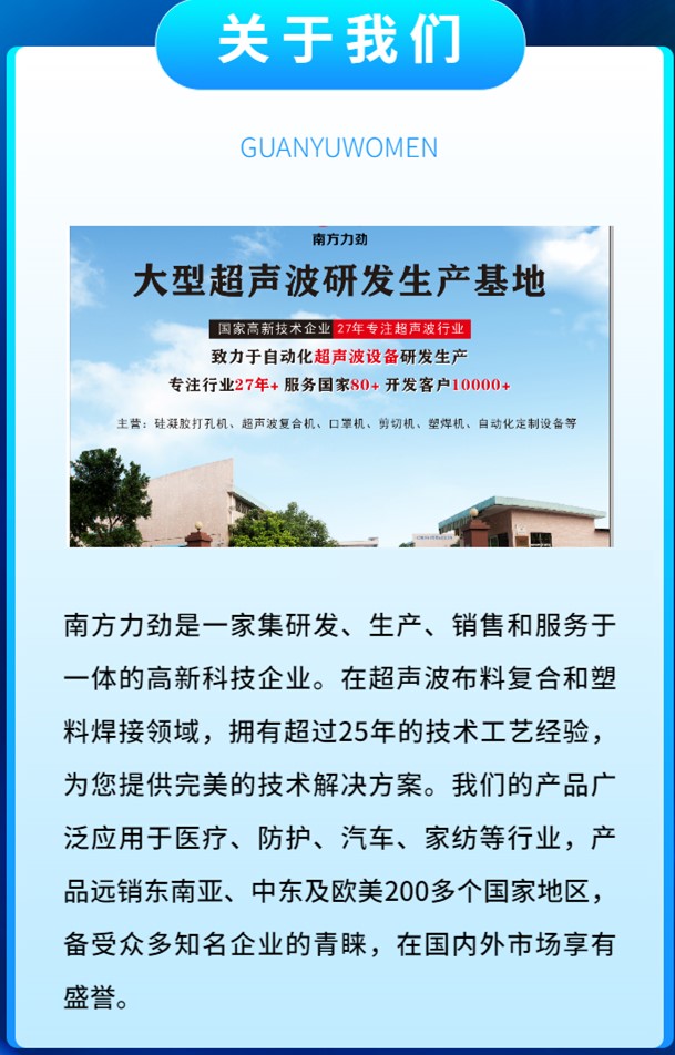 超聲波手術衣機的問世讓醫(yī)療領域煥發(fā)出新的活力。它不僅節(jié)約了生產(chǎn)成本,還提高了生產(chǎn)效率,確保了手術衣的質量和環(huán)境友好。作為行業(yè)領先廠商,南方力勁在超聲波設備行業(yè)擁有27年的研發(fā)生產(chǎn)經(jīng)驗,致力于為醫(yī)療行業(yè)提供最優(yōu)質的產(chǎn)品及創(chuàng)新解決方案。超聲波手術衣機就是其中的杰出代表,為我們帶來了更安全、更健康的未來